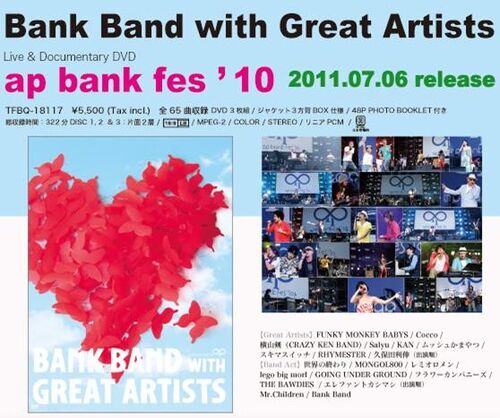 Bank Band with Great Artistsap bank fes'10 (2011.7.6 release) 収録曲が発表されました。 Disc 1 Bank Band よく来たねOPENINGBank Band カルアミルクDocumentary 1FUNKY MONKEY BABYS ちっぽけな勇気Cocco Raining横山剣 (CRAZY KEN BAND) タイガー&ド…